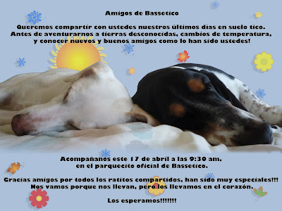 Los invitamos a la próxima reunión de Bassetico, el día 17 de Abril, a las 9:30 a.m. en el mismo parquecito de siempre. Esta reunión es muy especial porque es una despedida temporal para nuestros queridos amigos Manuel y Alexandra que se van un tiempito de Costa Rica, así todos a llegar el Sábado, si, no sera un domingo como siempre sino que sera el Sábado 17 de Abril.